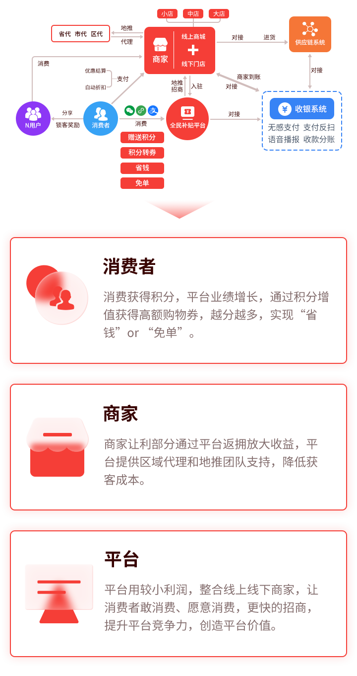 举例:商家A自行设置让利比例为20%,商家及其店内的消费者均可获得让利额等量的积分,同时还可获得积分数量5倍的消费券。